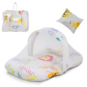SERVE MULTIPLE PURPOSES - New born baby nest, baby lounger is perfect travel portable bedding mattress. Newborn lounger is perfect for co-sleeping. Baby nest co sleeper to serve multiple purposes such as rest spot, tummy time and travel mat, it's easy to carry around the house. Nest bedding set is a portable and travel bed, a play mat and even a co sleeper. This newborn lounger mattress with head pillow and mosquito net is designed to prevents the baby from rolling out of the bed, creates a safe space for baby to sleep in bed with parents. Your baby will surely longer and comfortable sleep in this soft baby lounger pillow. This is also perfect for co-sleeping as it provides a safe space for the baby on the parents bed. The newborn sleeping bed is made of super soft pearl cotton & Fiberfill as the filling's material, no harmful substances will cause any harm to the baby, better protection for baby's spine. Using thicker fabric, so there will be no problems such as deformation and fading after machine washing. Soft cotton printed baby mattress with mosquito net and pillow is perfect for 0-12 months babies with attached mosquito net allows fresh air to breeze in, while blocks out insects and mosquitoes and dust. The mosquito net bed make sure your infant gets a good nights sleep without the danger of insect bites. This bedding set is ideal for keeping your baby well rested and comfortable day in and night out. This set can be a great gifting option for a friend expecting mother or a baby boys & baby girls or as a baby shower gift, or for someone who already has a baby boy and baby girl. It includes Carry bedding set required for comfortably sleeping for your newborn baby.
