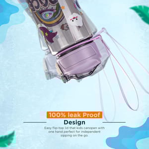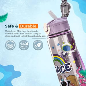 Keep your child refreshed and active all day with this Cute Space Theme Kids Water Bottle for School designed with vibrant astronaut, rocket, rainbow, shark, and ocean graphics that spark imagination while promoting healthy drinking habits. Made from BPA-free, non-toxic, food-grade material, this safe and eco-friendly kids water bottle with straw is perfect for carrying water, juice, or milk. The leak-proof flip lock lid and soft silicone straw sipper ensure spill-free sipping, making it ideal for school, travel, sports, cycling, and outdoor activities. This lightweight, durable, and reusable water bottle for kids fits easily into school bags, lunch bags, or backpack side pockets, while the wide-mouth design allows easy refilling, adding ice cubes, and hassle-free cleaning. Built to withstand daily use, it s the perfect choice for boys and girls who need a reliable drinking bottle for school and play. The attractive space print design water bottle also makes it an ideal gift for kids, birthday return gift, school prize, or picnic accessory. Whether for school, picnic, playground, or sports day, this kids sipper bottle with cartoon print keeps drinks fresh and your child ready for any adventure. Combine style, safety, and functionality with this adorable space astronaut kids water bottle with straw the perfect hydration partner for every little explorer.