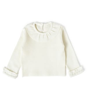 Dress set for girls in soft knit corduroy, pique fabric for the pre-winter season. Includes dress in soft 100% cotton with attached frill sleeves, wood-look button opening near the shoulder, gathered detailing at the empire line, and embroidered designs; and a full-sleeve, solid-colored top in a blend of 58% acrylic, 26% nylon, and 16% polyester with attached frill at the neckline, keyhole button opening at the back, and sewn-in, turned-up frilled cuffs. Available in different sizes for kids 0-6Y. Pack of 2.