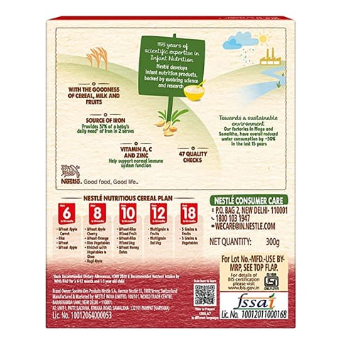 Nestle CERELAC Baby Cereal with Milk, Wheat Apple Cherry is a complementary food for babies from 8 to 12 months. While infants and children have higher requirements of nutrients than adults, 2 serves of CERELAC Wheat Apple Cherry Cereal provides 75% of a baby’s daily need of iron. It is also, a source of 18 important nutrients including vitamins and minerals. Nestle develops infant nutrition products backed by evolving science and research. Innovation has been at the heart of Nestle since its beginning.