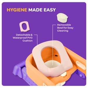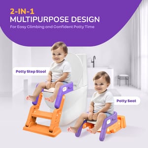 69b91c8d7500f286ce918874 R for Rabbit Hilltop Booster Purple Orange Potty Step Stool https://www.momeaze.com/s/62960a9d8f900ec4105c601b/69b91c907500f286ce918882/download-id-1rkeccc9pp6bx6r0v01qqfouyybjhfjaq.jpg R for Rabbit introduces Hilltop Booster, your all-in-one parenting hack that grows alongside your little explorer. Designed with care and crafted for convenience, this 2-in-1 step stool, and potty seat transforms in a matter of seconds, making the potty training easy, safe, and fun. Also, the plug N play installation is a boon for the busy parents and active children. Its anti-skid feature ensures stability on all surfaces, making it extremely safe. Additionally, the easy-grip handles are made to fit tiny hands, giving tiny tots confidence. It has an ergonomically designed seat with a soft, detachable cushion and a supportive backrest for comfort and security, particularly during extended bathroom breaks. The built-in splash also helps in preventing the unnecessary spills, while the removable inner bowl makes cleaning fast and fuss-free. R for Rabbit’s Hilltop Booster, is perfect for the curious minds, active body, and comforting security. Order Now! Key Features 2-in-1 Multipurpose: R for Rabbit’s Hilltop Booster functions both as a step stool and a potty seat, making it a versatile investment that grows with your child’s needs. Anti-Skid Base: The anti-skid base instils sense of security in the parents and independence and self-confidence in the children, motivating them to associate the potty time with positivity. Easy Grip Handles: R for Rabbit’s Hilltop Booster comes with easy grip handles to help the children feel secure and balanced while using the potty seat, encouraging independence. Supportive Backrest & Soft Cushion Seat: This ensures that the child sits comfortably with right posture support, making it safe. Also, the soft cushion makes it skin-friendly for sensitive skin. Built-in Splash Guard: R for Rabbit’s Hilltop Booster comes with a built-in splash guard to minimize the mess by preventing accidental spills, to potty train the children efficiently. Easy Maintenance: The removable inner bowl also allows for a quick disposal and easy cleaning, reducing the time and effort to maintain hygiene. Further, it also eliminates the need for scrubbing or complex assembly. Technical Specifications Name & Address of Manufacturer: Manufactured for and Marketed By R for Rabbit Country of Origin: India Net Quantity: 1 Dimension of Product: 43 X 18 X 59 cm Product Weight: 2.66 kg Package Weight: 3.54 kg Package Dimensions: 52 x 28 x 38 cm Age Group: 1-7 Years Weight Capacity: Upto 50kgs Material: PP Material PSSHTBPO3
