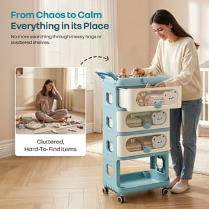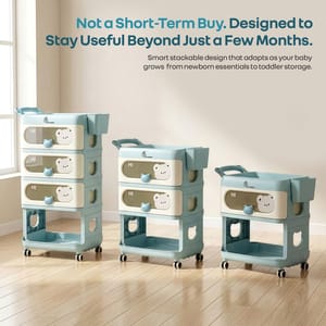 69b91b85188f75eb477625ae R for Rabbit Kiddo Korner Bear Blue Cream Organiser https://www.momeaze.com/s/62960a9d8f900ec4105c601b/69b91b88188f75eb477625b7/download-id-1fibqfqib-wi8zevlvd0pbe-cmczww6d5.jpg Tired of digging through cupboards and wardrobes every time your baby needs something? Make every day parenting simpler with the Kiddo Korner Bear by R for Rabbit, a baby friendly, smart organizer that keeps all your kid’s essentials right where you need them. Thoughtfully designed to make life easier, this adorable organizer comes with three spacious drawers with peek-through windows, so you can quickly find diapers, clothes, or feeding essentials without any hassle. The cute teddy bear handles on the drawer make it more playful, the open bottom storage is perfect to keep your kid’s toys, makes it easy for them to reach and enjoy independently. The pastel colors and appealing design of Kiddo Korner Bear merge beautifully into your kid’s room. It comes with smooth 360° rotating wheels, top pull handle, and detachable side basket to make it easy to move wherever you need it, while wheel locks keep it steady and safe once in place. The wheels also make it super convenient to move the organizer for household cleaning. Because organizing your baby’s essentials shouldn’t feel overwhelming, it should feel pleasant, joyful, and just a little bit fun. Key Features Baby-Friendly Design: R for Rabbit’s Kiddo Korner Bear has smooth, rounded edges with injury-free curves while maintaining a modern and sleek look. 5 Spacious Storage Compartments: This adorable organizer includes 3 spacious sliding drawers, 1 open storage space at the bottom, and a top flat storage surface for frequently used items like wipes, creams or feeding bottles. Helps organize all baby essentials in one place. Effortless Mobility with Safety Lock: R for Rabbit’s Kiddo Korner Bear has 360° rotating, durable wheels with front wheel lock and a top handle for easy movement and secure placement. Detachable Side Storage Basket: It comes with a little detachable basket to store bottles, or small essentials of your little one. Peek-a- boo bear design: R for Rabbit’s Kiddo Korner Bear comes with adorable bear handles and playful peeking bear detail, which makes your baby’s room more aesthetically playful. Technical Specifications Name & Address of Manufacturer: Manufactured for and Marketed By R for Rabbit Country of Origin: PRC Net Quantity: 1 No. Dimension of Product: 57 x 33 x 90 cm Product Weight: 4.57 kg Package Weight: 5.7 kg Package Dimensions: 46 x 37 x 45 cm Storage Capacity: 11 Litre Per Drawer. Material: PP Material ORKKBBLC2