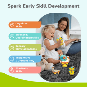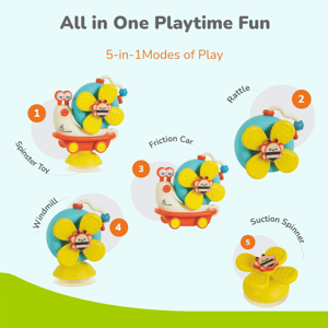 Keeping your little one entertained while supporting their growth just got a lot easier with r for Rabbit’s Orapple Spinster! Made with BPA free material, this toy is non toxic, safe and durable. This toy is designed to entertain your kids in 5 different modes- it is a spinster, rattle, friction car, suction spinner and windmill all in one. Designed to stimulate your little one’s senses with it’s colourful design, encourage exploration and support early development, it transforms playtime into a delightful learning experience. R for Rabbit’s Orapple Spinster has a rotating head, sliding beads and twisting gears to upskill your kids' visual, auditory, hand-eye coordination, fine motor and various other cognitive skills. This toy has rounded edges that ensure risk-free playtime. It also has a sensory-rich texture that helps engage your child’s senses to their optimum advantage. Plus, its suction spinner feature easily attaches to surfaces making it a perfect travel and bath time partner. R for Rabbit’s Spinster is a one-time investment to engage the kids with multi-functional play. Order Now! Key Features Safety first: R for Rabit’s Orapple Spinster is made with BPA-free material that makes it safe, non-toxic, and durable. This helps maintain its complex design for children’s playtime fun. 5 in 1 Multipurpose: It comes with five play mode toys, ranging from spinster, rattle friction, windmill, and suction that provide the kids with variety for their engagement. Injury-free Round Edges: R for Rabbit’s Spinster also comes with smooth and round edges to prevent any cuts, scars, or injuries to your child’s sensitive skin allowing easy gripping, spinning and exploration. Skill Development: It helps support visual, auditory learning, hand – eye coordination, fine motor skills and creativity among various other cognitive skills laying a strong foundation for growth. Interactive Play: R for Rabbit’s Orapple Spinster features sliding beads and twisting gears that spark curiosity and encourage hands-on experience. Ideal for Gifting: Orapple Spinster is an ideal gift for curious little minds to help them engage and learn through interactive play, anywhere anytime. Technical Specifications Name & Address of Manufacturer: Manufactured for and Marketed By R for Rabbit Country of Origin: India Net Quantity: 1 Dimension of Product: 12 X 7 X 16 cm Product Weight: 0.19 kgs Package Weight: 0.24kgs Package Dimensions: 13 X 7.5 X 16.5 cm Age Group: 6 Months + Material: BPA Free PP Material