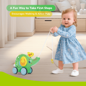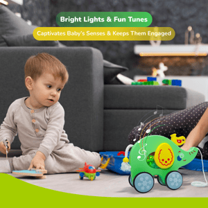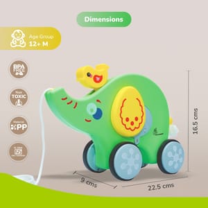 Say hello to R for Rabbit’s Orapple Trunky, a cute Trunky and Tweety duo making every step an exciting adventure. This musical pull-along toy is made of BPA-free material making it safe, durable, and toddler-safe. This charming toy is a wonderful way to encourage your little one’s first steps, balance and coordination. This toy comes with an attached thread and easy grip handles for tiny hands to comfortably play with it by pulling, sliding, and rolling it. The smooth rolling wheels ensure effortless movement on any surface and scratch-free playtime. As your little one pulls and plays with Orapple Trunky the lights and cheerful music make every moment magical, stimulating their senses and keeping them entertained. R for Rabbit’s Orapple Trunky is more than just a toy it supports your little one’s motor skill development and imaginative play. Plus, the injury-free edges and smooth design encourages a stress-free and injury-free fun time. Whether it is a playful stroll around the house or an exciting adventure R for Rabbit’s Orapple Trunky is the most adorable toy for your little munchkin! Order yours Now! Key Features Safety First: R for Rabbit’s Trunky is made up of BPA-free material that makes it safe, durable, and toddler-safe to encourage the kids to interact and play with it without any stress. Pull, Slide & Roll: Designed to encourage active movement in your little one, this toy helps improve walking, balance and coordination in growing toddlers Lights & Music: R for Rabbit’s Trunky engages your little one with light and cheerful music creating a sensory experience that entertains your child. Smooth Wheels: It is built with friction-free smooth rolling wheels that enhance the toy’s durability and promote a scratch-free riding experience. Skills Development: R for Rabbit’s Trunky helps in enhancing various visual, auditory, sensory, hand-eye coordination, and various other cognitive skills, which also boosts their self-confidence and independence to self-engage. Ideal for Gifting: This thoughtful and engaging gift choice is a perfect gift for birthdays, special occasions or to simply put a smile on your little one’s face. Technical Specifications Name & Address of Manufacturer: Manufactured for and Marketed By R for Rabbit Country of Origin: India Net Quantity: 1 Dimension of Product: 22.5 X 9X 16.5 cms Product Weight: 0.25 kg Package Weight: 0.40 kg Package Dimensions: 26.8 X 11.3 X 18.4 cm Age Group: 12 Months + Material: BPA Free PP Material