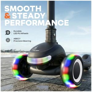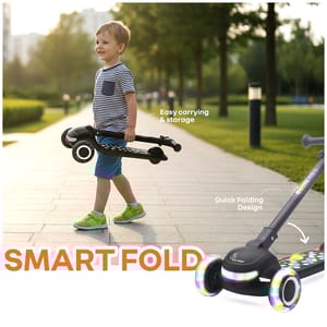 RR for Rabbit is introducing Road Runner Jazz, the scooter that doesn’t just roll, but also rocks. It is designed for little thrill-seekers with big style, and inbuilt lights for extra fun. With glowing wheels, funky tunes, and smooth-as-butter movement, it turns every scoot into a parade of fun. Also, the durable PU LED wheels with ABEC7 bearings provide an effortless movement, which aren’t just flashy, but also tough to handle every twist, turn, and tiny pebble in your path. It also has anti-slip wide footrest for strength and stability, while the gravity steering makes turning smoother than butter. And when it’s time to wrap up the fun, the smart fold design enhances it within a matter of seconds. In addition, it also has four-levels of height adjustments to make it adaptable with the child’s growing age. R for Rabbit’s Road Runner Jazz is fun, stylish, smooth, and musical. Order Now! Key Features Safety First: R for Rabbit’s Road Runner Jazz is BIS safety certified, built with wide, anti-slip footrest, to ensure security in every ride. Also, the sturdy base provides the kids with the confidence for balance and posture, building confidence with every glide. It is also perfect for developing coordination, while keeping the safety intact. Effortless Glide: Equipped with ABEC7 bearings and durable LED PU wheels, it offers a smooth ride across all surfaces. It also helps children refine their balance and motor skills, while enjoying effortless movement that feels almost magical. Lights and Beats: R for Rabbit’s Road Runner Jazz has built-in lights and cheerful music to make every ride a sensory experience. Also, the combination of rhythm and glow sparks curiosity and self-expression in children, assisting them in confidence-boosting experience. Four Levels Height Adjustment: It is also designed to keep up with your child’s growth spurts, with adjustable handlebar, ensuring long-term use and comfort. This scooter is designed to grow with your little one, becoming their best riding companion year after year. Fold, Grab, Go: R for Rabbit’s Road Runner Jazz includes smart folding design, providing the kids with an ease to fold, carry, and store the scooter even in a compact space. This develops independence and responsibility, supporting a compact, convenient, and travel-friendly adventure. Technical Specifications Name & Address of Manufacturer: Manufactured for and Marketed By R for Rabbit Net Quantity: 1 Dimension of Product: 31 X 60 X 93 cm Product Weight: 3.25 kgs Package Weight: 3.60 kgs Package Dimensions: 64.5 X 17 X 32.5 cm Age Group: 3+ Years Weight Capacity: Upto 75 kgs Material: PP with Aluminium and Steel Material