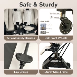 Parenting does not come with a pause button, and neither should your stroller. The Street Smart Regal is the stroller that matches your stride and your style. It has a five-point harness to keep the kids safe and give them the freedom to tame their curiosity. In addition, its two-way reversible seat with multi-recline and easy fold makes it a versatile option for the babies. It is also very compact and travel-friendly, built with a strong and durable steel frame to offer superior and lasting support everywhere you go. In addition, the soft cushion makes the baby extra comfortable and cozy during every journey. Crafted for the multitasking parent who juggle diaper bags, phone calls, and baby giggles all in one hand, this stroller is your everyday sidekick in parenting adventures. R for Rabbit’s Street Smart Regal to cruise in style! Key Features Safety Certified: R for Rabbit’s Street Smart Regal is EN 1888 safety certified and comes with a five-point harness system that keeps the baby safe and secure. Offering parents a stress-free experience. Two-Way Reversible Seat & Multi-Reclination: This feature enables the parents to switch the baby’s view, according to their needs, enhancing the parent- child bond. Also, the kid can either explore the world or just be seated facing their caretakers, to seek their support. One-Hand Smart Auto Fold: R for Rabbit’s Street Smart Regal comes with a one-hand smart auto fold, making the stroller easy to carry and store just anywhere. Smart! Isn’t it? Strong & Durable: This stroller has a steel frame, making it strong and durable. This is a multi-feature, one-time investment. Wheels with Link Brakes & Suspension: R for Rabbit’s Street Smart Regal comes with efficient link brakes and suspension, making the ride smooth, trustworthy, and stress-free. Technical Specifications Name & Address of Manufacturer: Manufactured for and Marketed By R for Rabbit Country of Origin: PRC Net Quantity: 1 Dimension of Product: 64 X 56 X 101 cm Product Weight: 10.5 kg Package Weight: 11.5 kg Package Dimensions: 50 X 26 X65 cm Age Group: 0-3 Years Weight Capacity: Upto 20 kgs Material: Steel Frame with Polyester Fabric