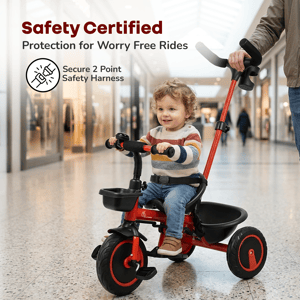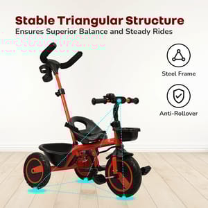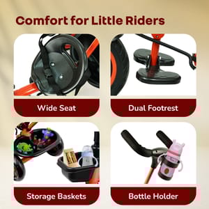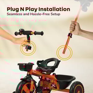 Tiny Toes R20 Plus Plug & Play Tricycle for Kids Kids love to enjoy the evening play time; you can double the fun for your child. Do you know how? R for Rabbit brings you Tiny Toes R20 Plus Smart Plug & Play Baby Tricycle. Tiny Toes R20 Plus is a classy-looking tricycle for kids with all the safety features loaded and blended with cute features. Absolutely comfortable for the little one, this Tricycle has smart parental control to never let your child go off track. Top quality rubber wheels to let your child enjoy the ride. Tiny Toes R20 Plus tricycle for a baby is the perfect tricycle to be. Key Features BIS Safety First: Tiny Toes R20 Plus tricycle is a BIS safety certified tricycle for kids. It is loaded with safety features to make riding time absolutely safe for your little one. Classy Design: Cute, elegant design tricycle is truly adorable for your baby. Plug & Play: The tricycle is very easy to install as it comes with Plug & Play feature Top Quality Rubber Wheels: R for Rabbit Tiny Toes R20 Plus is having high quality rubber wheels to make the tricycle run smoothly and let your child have fun. Adjustable Parental Control: Smart looking parental control to keep the tricycle on safe track Front & Rear Basket: Let the child take the small little toys and necessities together Technical Specifications Name & Address of Manufacturer: Manufactured for and Marketed By R for Rabbit Country of Origin: India Net Quantity: 1 Dimension of Product: 85cm (L) X 52cm (B) X 111cm (H) Product Weight: 7.52 kg Package Weight: 8.62 kg Package Dimensions: 58.5 x 36 x 31.3 cm Age Group: 2-5 Years Weight Capacity: Upto 25kgs Material: High Quality Steel Body with rubber wheels