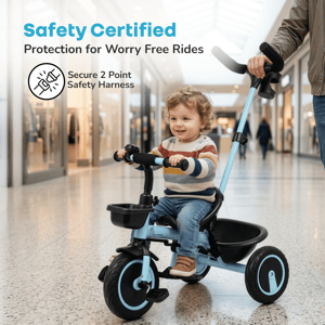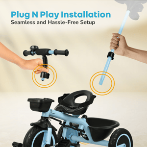 Tiny Toes R20 Plus Plug & Play Tricycle for Kids Kids love to enjoy the evening play time; you can double the fun for your child. Do you know how? R for Rabbit brings you Tiny Toes R20 Plus Smart Plug & Play Baby Tricycle. Tiny Toes R20 Plus is a classy-looking tricycle for kids with all the safety features loaded and blended with cute features. Absolutely comfortable for the little one, this Tricycle has smart parental control to never let your child go off track. Top quality rubber wheels to let your child enjoy the ride. Tiny Toes R20 Plus tricycle for a baby is the perfect tricycle to be. Key Features BIS Safety First: Tiny Toes R20 Plus tricycle is a BIS safety certified tricycle for kids. It is loaded with safety features to make riding time absolutely safe for your little one. Classy Design: Cute, elegant design tricycle is truly adorable for your baby. Plug & Play: The tricycle is very easy to install as it comes with Plug & Play feature Top Quality Rubber Wheels: R for Rabbit Tiny Toes R20 Plus is having high quality rubber wheels to make the tricycle run smoothly and let your child have fun. Adjustable Parental Control: Smart looking parental control to keep the tricycle on safe track Front & Rear Basket: Let the child take the small little toys and necessities together Technical Specifications Name & Address of Manufacturer: Manufactured for and Marketed By R for Rabbit Country of Origin: India Net Quantity: 1 Dimension of Product: 85cm (L) X 52cm (B) X 111cm (H) Product Weight: 7.52 kg Package Weight: 8.62 kg Package Dimensions: 58.5 x 36 x 31.3 cm Age Group: 2-5 Years Weight Capacity: Upto 25kgs Material: High Quality Steel Body with rubber wheels