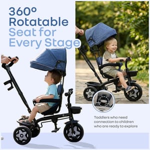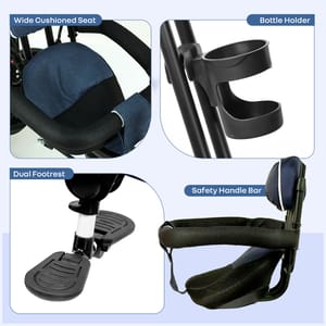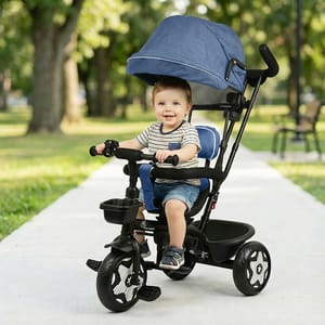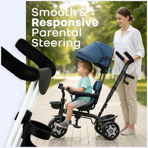 R for Rabbit is introducing Tiny Toes R40 Ace, a tricycle for the first step towards their independence, exploration, and joy for wheels. It is thoughtfully designed with a 360° rotatable seat for parent-facing & forward-facing mode, effortlessly adapting as your child grows from a curious infant to a confident toddler. It also features an adjustable canopy that protects against harmful UV radiation during outdoor play, and a parental control handle to steer safely while your child learns to pedal independently. Also, with the front and rear baskets, it becomes an efficient storage space for kids’ toys and essentials. The comfortable, wide seat also ensures that every ride becomes a delightful experience, along with EVA wheels and dual footrest to ensure smooth, stable rides on any surface. This further promotes physical and sensory development in children through fun and safe motion. It also nurtures balance, coordination, and motor skills, while allowing parents to guide and encourage independent movement. R for Rabbit’s Tiny Toes R40 Ace is safe, fun, and perfect for little one’s adventures. Order Now. Key Features Safety Certified: R for Rabbit’s Tiny Toes R40 Ace is a BIS safety-certified design with a sturdy frame, safety harness, and parental steering control, providing the child with safety at every turn. It also helps children build confidence and trust, as they learn to balance and pedal independently. 360° Reversible Seat: The rotatable seat also allows parents to maintain eye contact with younger riders or switch to forward-facing mode as they grow. This flexibility also provides them with the necessary emotional bonding, while also encouraging curiosity through safe exploration. Adjustable Canopy for UV Protection: R for Rabbit’s Tiny Toes R40 Ace also comes with an adjustable canopy to protect the children from sun exposure and make outdoor playtime safe and comfortable. It further encourages outdoor activity while also promoting sensory awareness and connection with nature. Plug N Play EVA Wheels: The tricycle is also equipped with durable and smooth-rolling wheels that offer stability on multiple surfaces, enhancing your child’s gross motor coordination, and providing effortless and fun rides. Comfort & Convenience: R for Rabbit’s Tiny Toes R40 Ace also features a spacious seat, footrests on both sides, and front and rear baskets, to provide both comfort and practicality for the child. It further helps the kids learn balance, spatial awareness, and responsibility through play. Technical Specifications Name & Address of Manufacturer: Manufactured for and Marketed By R for Rabbit Country of Origin: India Net Quantity: 1 Dimension of Product: 80cm (L) X 52cm (B) X 115cm (H) Product Weight: 7.32 kg Package Weight: 8.78 kg Package Dimensions: 68.5cm (L) X 37cm (B) X 37.5cm (H) Age Group: 2-5 Years Weight Capacity: Upto 25Kg Material: Body: Steel Frame Structure with plastic basket with polyester fabric material