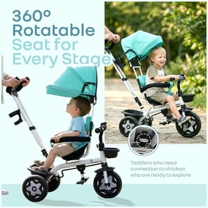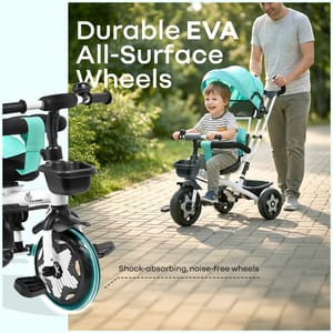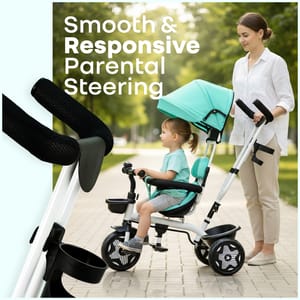 R for Rabbit is introducing Tiny Toes R40 Ace, a tricycle for the first step towards their independence, exploration, and joy for wheels. It is thoughtfully designed with a 360° rotatable seat for parent-facing & forward-facing mode, effortlessly adapting as your child grows from a curious infant to a confident toddler. It also features an adjustable canopy that protects against harmful UV radiation during outdoor play, and a parental control handle to steer safely while your child learns to pedal independently. Also, with the front and rear baskets, it becomes an efficient storage space for kids’ toys and essentials. The comfortable, wide seat also ensures that every ride becomes a delightful experience, along with EVA wheels and dual footrest to ensure smooth, stable rides on any surface. This further promotes physical and sensory development in children through fun and safe motion. It also nurtures balance, coordination, and motor skills, while allowing parents to guide and encourage independent movement. R for Rabbit’s Tiny Toes R40 Ace is safe, fun, and perfect for little one’s adventures. Order Now. Key Features Safety Certified: R for Rabbit’s Tiny Toes R40 Ace is a BIS safety-certified design with a sturdy frame, safety harness, and parental steering control, providing the child with safety at every turn. It also helps children build confidence and trust, as they learn to balance and pedal independently. 360° Reversible Seat: The rotatable seat also allows parents to maintain eye contact with younger riders or switch to forward-facing mode as they grow. This flexibility also provides them with the necessary emotional bonding, while also encouraging curiosity through safe exploration. Adjustable Canopy for UV Protection: R for Rabbit’s Tiny Toes R40 Ace also comes with an adjustable canopy to protect the children from sun exposure and make outdoor playtime safe and comfortable. It further encourages outdoor activity while also promoting sensory awareness and connection with nature. Plug N Play EVA Wheels: The tricycle is also equipped with durable and smooth-rolling wheels that offer stability on multiple surfaces, enhancing your child’s gross motor coordination, and providing effortless and fun rides. Comfort & Convenience: R for Rabbit’s Tiny Toes R40 Ace also features a spacious seat, footrests on both sides, and front and rear baskets, to provide both comfort and practicality for the child. It further helps the kids learn balance, spatial awareness, and responsibility through play. Technical Specifications Name & Address of Manufacturer: Manufactured for and Marketed By R for Rabbit Country of Origin: India Net Quantity: 1 Dimension of Product: 80cm (L) X 52cm (B) X 115cm (H) Product Weight: 7.32 kg Package Weight: 8.78 kg Package Dimensions: 68.5cm (L) X 37cm (B) X 37.5cm (H) Age Group: 2-5 Years Weight Capacity: Upto 25Kg Material: Body: Steel Frame Structure with plastic basket with polyester fabric material