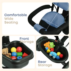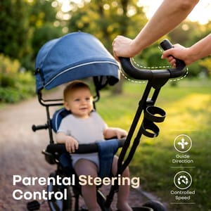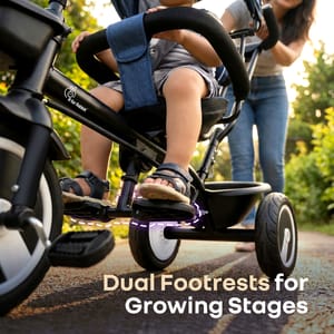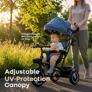 R for Rabbit is introducing Tiny Toes R40 Plus Tricycle, thoughtfully designed to support the baby’s developmental journey. From building balance and motor skills, to nurturing independence and curiosity, this tricycle provides a 360-degree reversible seat and plug-n-play structure to allow the kids to begin exploring the world with the reassurance for safety. It also includes smooth rubber wheels, sturdy construction, and comfortable wide seat to provide stability for mastering coordination and spatial awareness. With every ride, children exercise important physical skills, stimulate their senses, and build emotional security through the soft, adjustable-parental control for smooth steering, until the kid learns to drive himself. Also, the adjustable canopy protects the child against harmful UV rays, ensuring a safe and comfortable outdoor time. It also includes front and rear baskets as spacious storage and also includes footrest on both sides to ensure safe exploration, independence, and joy. R for Rabbit’s Tiny Toes R40 Plus Tricycle is cute, comfortable, and adjustable. Order Now! Key Features BIS Certified Safety First: R for Rabbit’s Tiny Toes R40 Plus Tricycle is BIS safety certified, built with a child-focused design that prioritizes stability, security, and comfort at every stage of riding. From sturdy frame to parent-controlled steering and cushioned wheels, every element works together to keep the little one safe. 360° Rotatable Seat: This innovative seat design allows the infant to switch position, based on convenience. This would also help in bonding and reassurance. As the child grows, forward-facing mode promotes independence and curiosity with safe seating. Smooth Plug N Play Wheels: R for Rabbit’s Tiny Toes R40 Plus Tricycle also consists of high-quality rubber wheels to provide a stable, cushioned, and noise-free ride across multiple surfaces. Also, the plug-n-play allows easy assembly for smooth exploration. Adjustable UV-Protection Canopy: The UV-safe canopy shields the child’s delicate skin from harmful sun exposure, enabling longer, and safer outdoor adventures. Also, its adjustable design ensures optimal shade and comfort throughout the ride. Parental Control Handle: R for Rabbit’s Tiny Toes R40 Plus Tricycle has an adjustable parental controlled handle to allow the adults to steer and regulate the speed with ease. It also supports the young riders as they learn to self-pedal at a comfortable pace. Dual Footrests & Spacious Storage: Side footrests offer ergonomic and secure support for younger children who aren’t pedaling. Also, front and rear baskets provide practical storage for toys and essentials without affecting balance. Technical Specifications Name & Address of Manufacturer: Manufactured for and Marketed By R for Rabbit Country of Origin: India Net Quantity: 1 Dimension of Product: 83cm (L) X 52cm (B) X 99cm (H) Product Weight: 10.16kg Package Weight: 11.62 kg Package Dimensions: 68.5cm (L) X 37cm (B) X 37.5cm (H) Age Group: 2-5 Years Weight Capacity: Upto 25Kg Material: Body: Steel Basket & Seat: Plastic Wheels: Rubber Handle: Rubber for Grip Push Bar: Steel Fabric: 80% Polyester 20% Cotton for Canopy & Seat