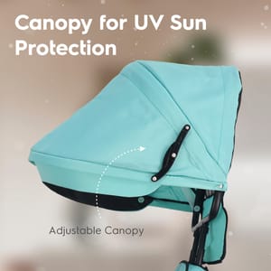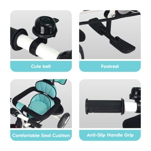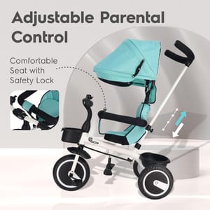 Add style to your baby's evening playtime with R for Rabbit's Tiny Toes T30 Ace tricycle. This tricycle is BIS certified to ensure complete safety of your kids and an easy plug & play model for ease of installation. To add more comfort, the seats are plushy and come with a footrest so your baby can sit and enjoy surroundings when not riding the tricycle. Equipped with front and back baskets, your child can carry all they need in Tiny Toes T30 Ace to make their rides more fun. R for Rabbit Tiny Toes T30 Ace also has parental control with high-quality canopy so you can protect them from dirt and harsh sunlight while steering them in safe directions. Bring home Tiny Toes T30 Ace and give your baby a stylish fun ride. Key Features BIS Safety Certified: Tiny Toes T30 Ace tricycle is BIS safety certified and has safety belts for the complete safety and security of your baby. Plug & Play EVA Wheels: Quick and easy to install, Tiny Toes T30 Ace comes with EVA wheels and plug and play model for smooth and fun rides. Front & Back Basket: Your child can carry their favorite toys and some necessary things easily in the two baskets. Adjustable Parental Control with Canopy: Steer them safely using parental control to ensure safe rides and protect them from dirt and harsh sunlight by pulling down the canopy. Comfortable Seat with Footrest: R for Rabbit Tiny Toes T30 Ace comes with incredibly comfortable seating for longer rides. It also has a footrest so your child can take a break and enjoy sitting on a tricycle.