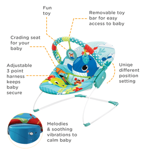 Coming to your rescue, this vibration enabled bouncer makes sure that you don't have to worry about your child getting adequate rest. The bouncing motion calms your child and ensures that they are comforted and gently lulled into sleep. Return and exchange policies: Non - Returnable Exchangeable in case of product damage or if the product is expired (Terms and Conditions applied) Terms & Conditions: The product should not be opened Image of the product with the invoice must be provided Any Complaint should be raised within 8hrs of delivery