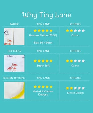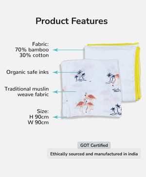 - Key Features: Super Soft Bamboo fabric - Zero irritation on skin. 70% Bamboo & 30% Cotton Anti-bacterial - No bad odor Muslin Weave - Breathable & Thermo-regulating 100% Safe ink - Perfect for baby's delicate skin (GOTS Certified) One swaddle many uses - Cot sheet, nursing cover, play mat, etc,. Perfect Size for Indian Babies - Easy for handling the infant.