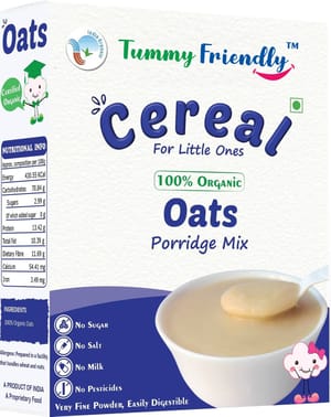 Certified 100% Organic Oats Porridge Mix | 200g Oats are famous for Beta-Glucan, a soluble fibre that promotes heart health and healthy gut bacteria Oats are known to have high levels of Manganese, an essential mineral for bone health and nutrient metabolism Oats are an excellent source of molybdenum, an essential mineral which activates enzymes that help break down harmful sulfites and prevent toxins from building up in the body ? Oats are also a very good source of phosphorus as well as a good source of copper, biotin, vitamin B1, magnesium, dietary fiber, chromium and zinc ? Oats are a good source of Protein and Iron ? At TummyFriendly Foods, we are committed to providing the maximum possible nutrition from Real-Food with 18 nutrient-rich sprouted whole grains, pulses, vegetables, fruits and nuts. ? Available in 200 g packs and 50 g Baby Packs for trial ? India-OrganicCertified. ?Certified Organic Food For Little Ones 6+ month Shelf-Life ? No Sugar, No Salt, No Chemicals, No Pesticides, No GMO, No extracts and No Unhealthy Ingredients ? Only Real Food!