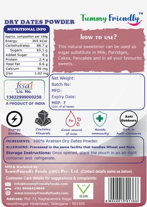 Tummy Friendly Foods Dry Dates Powder, from Premium Arabian Dates - 200g NO HIDDEN SUGAR Natural Sweetener Dates Powder for babies kids and adults | No added Sugar (Absolutely NO hidden sugar) Healthy Sugar Substitute Kharek Powder for Baby Dates are rich in dietary fibre which helps in better digestion and a healthy gut. Rich in antioxidants, a good source of Iron, Calcium, Potassium, Vitamins and Minerals for the overall health and growth of little ones