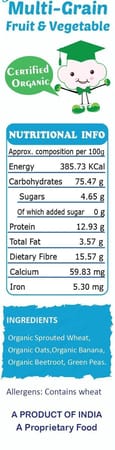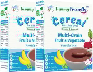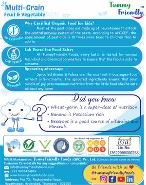 690db88e087e17cdf5fb3ddc TummyFriendly Foods Organic Sprouted Multi Grain Fruit Vegetable Porridge Mix|400g, (200g each pack) https://www.momeaze.com/s/62960a9d8f900ec4105c601b/690dbf6c087e17cdf5fb455c/400-organic-sprouted-multi-grain-fruit-vegetable-porridge-mix-original-imahg4m3z54kyarj.jpg India-OrganicCertified. No Sugar, No Salt, No Chemicals, No Pesticides & No GMO. The germination process in Wheat is known to multiply WHEAT-GERM, a concentrated super-dose of nutrition with loads of essential nutrients. Oats are famous for Beta-Glucan, a soluble fibre that promotes heart health and healthy gut bacteria. Rich in Dietary-Fibre which keeps the little tummy happy and healthy. TummyFriendly Foods: Maximum Possible Bio-available Nutrition from Real Food. No extracts, no unhealthy ingredients. Freshly-made in Small Batches. Can be cooked under 5 min. Sprouted grains, so easy to digest. TFF-MgFtVg-2x200