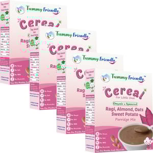 Certified Organic Sprouted Ragi, Almond, Oats, Sweet Potato Porridge Mix for little ones, 200g . Why Sprouting. Because, when sprouted the grains & pulses germinate into Baby plants with the nutritional capacity to grow into big plants. . Sprouting reduces the anti-nutrients and multiplies the nutritional content of the food . Ragi is rich in Calcium and Iron which promote bone growth and overall development. . The germination process in Ragi is known to multiply the bio-availability of all its Macro & Micro nutrients including Vitamins & Minerals. . Almonds are a great source of Healthy-Fat . Oats are famous for Beta-Glucan, a soluble fiber that promotes heart health and healthy gut bacteria. . Sweet Potato is an excellent source of Vitamin A. . Rich in Dietary-Fibre which keeps the little tummy happy and healthy. . Excellent for rapid growth years, year on year .Certified Organic Food For Little Ones 8+ month Shelf-Life . No Sugar, No Salt, No Chemicals, No Pesticides, No GMO, No extracts and No Unhealthy Ingredients. . Only Real Food!