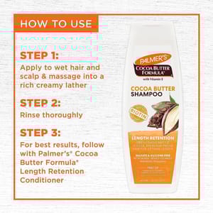 4801Delivery in 5-7 working days Palmer's Cocoa Butter Formula Length Retention system with Biotin, fully strengthens hair with powerhouse natural protectants that help block fragileness, brittleness, breakage and split ends, to help hair achieve its optimal length. This creamy, silicone free, non stripping , color safe shampoo, gently lifts away oil, dirt and build up with strengthening protectants, while leaving strands perfectly prepared for conditioning.