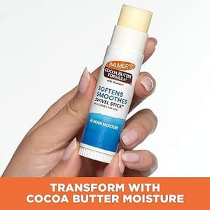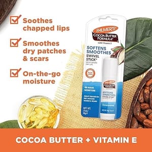 This innovative product is the portable version of the original solid formula Palmer s Cocoa Butter Formula and has all the benefits of pure Cocoa Butter enriched with Vitamin E, moisturize, soothe dry, cracked and chapped lips. This pocket-size stick, is also ideal for relieving rough, dry areas, marks and blemishes on the face and body.